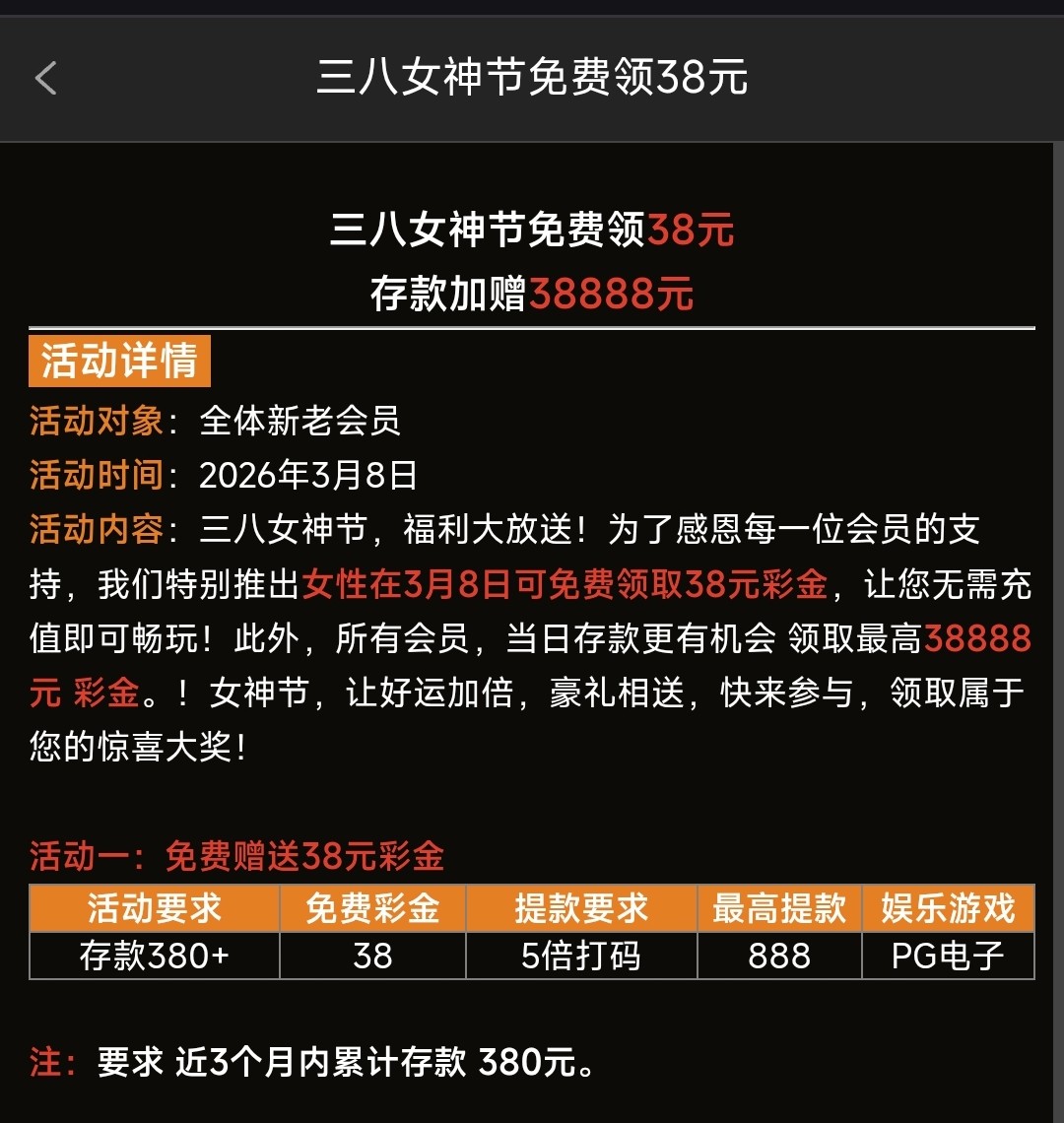 近三个月累计存款380以上“8号”上线联系客服领取38彩金,5倍流水,最高提款888,仅限娱乐PG电子,仅限女性